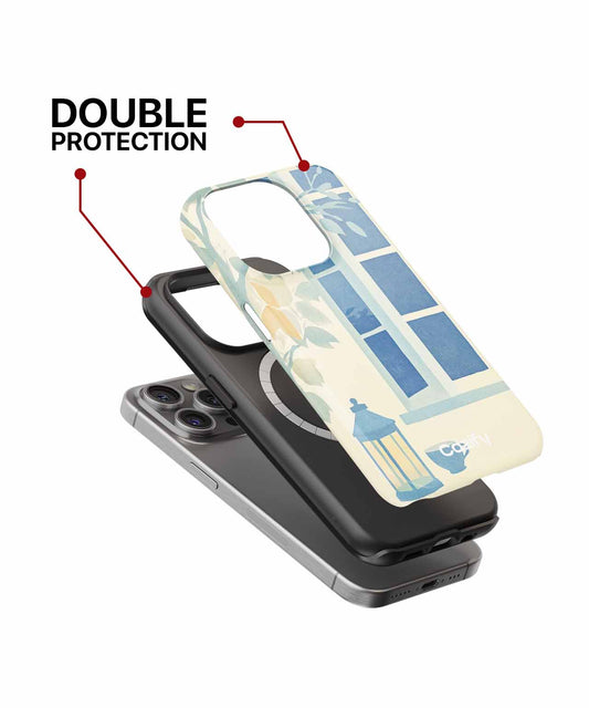 Cozy blue window with lantern and cup iPhone case